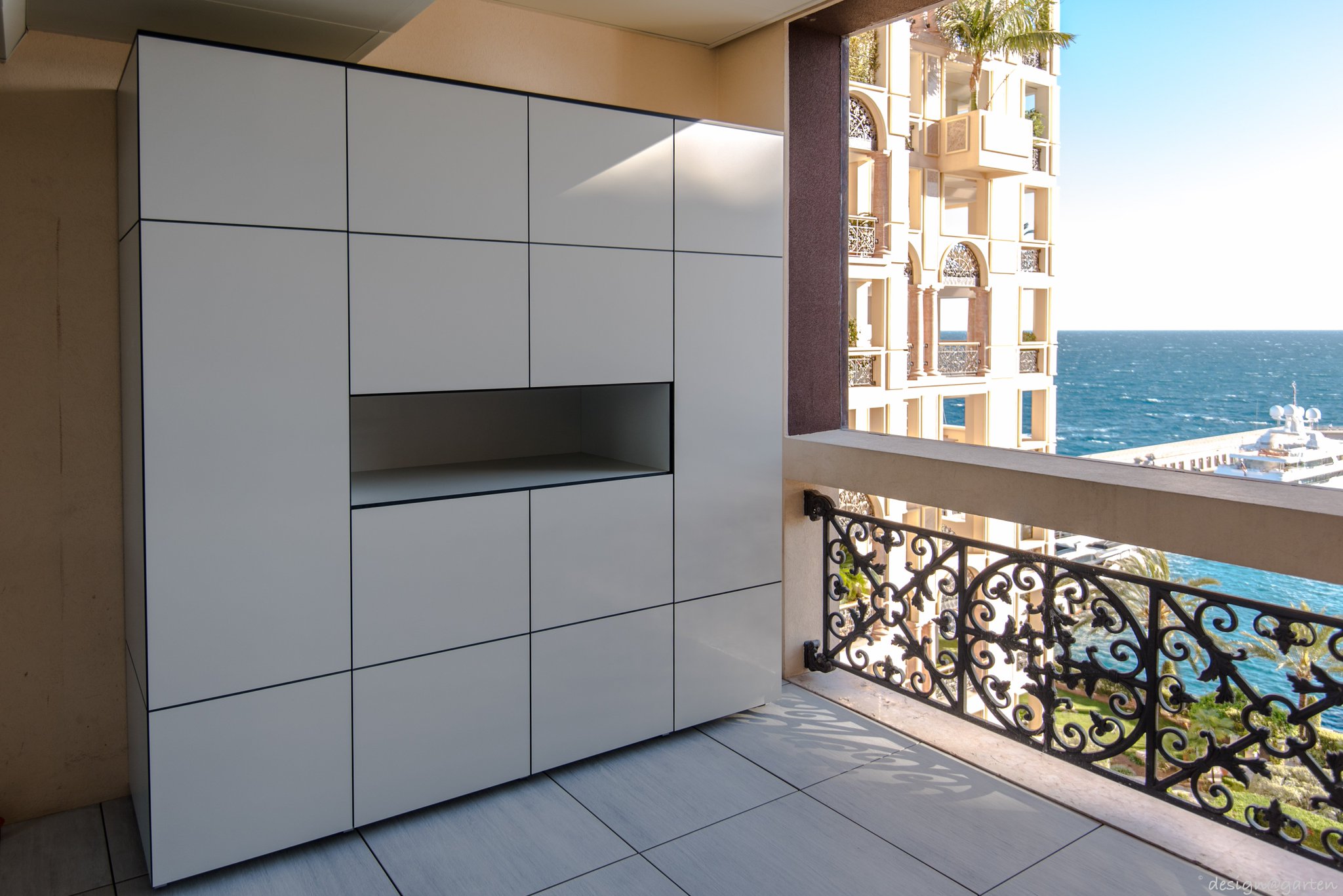 Terrassenschrank wetterfest mit angebauten sichtschutz, befestigung ausschließlich an schrankwand mit sideboard.